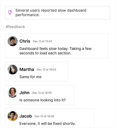 Long Slack threads are summarized automatically, so teams can quickly understand the core feedback without reading every message.